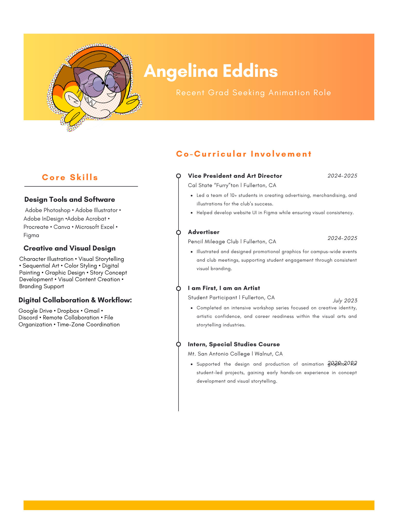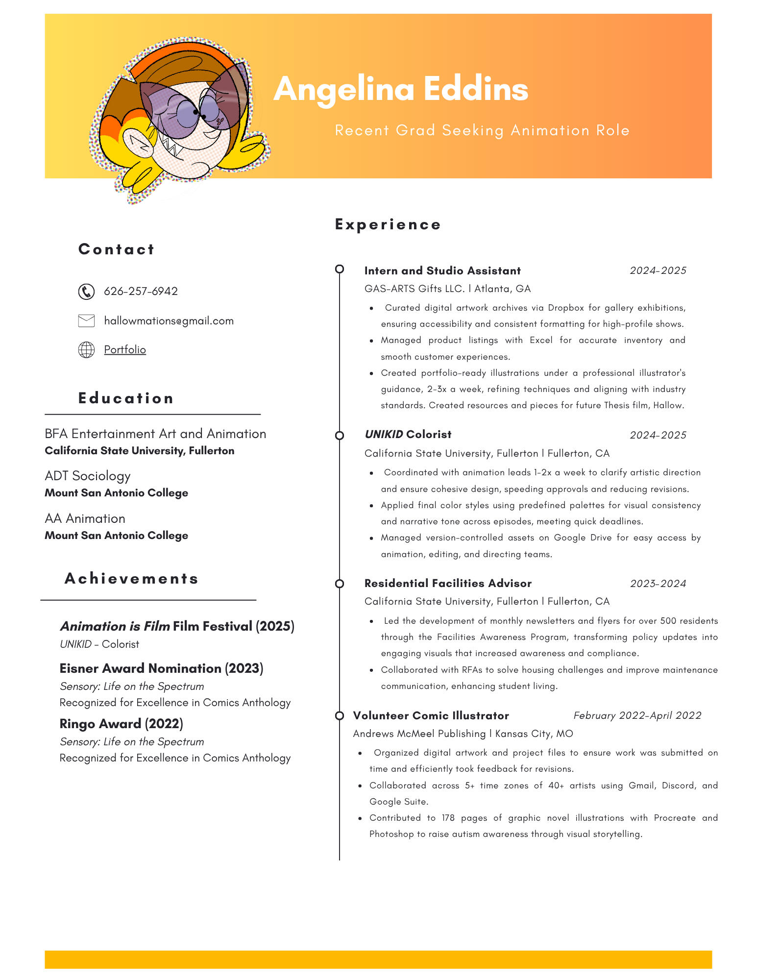 Hello! My name is Angelina Eddins, and I’m excited to share a little about myself with you.I’m a neurodivergent artist currently living in the vibrant Los Angeles area, and I am in the final stages of completing my B.F.A. in Entertainment Arts and Animation at CSUF. My passion for animation has always inspired me, and I’ve long dreamed of building a career in this amazing industry.During my studies, I had the incredible opportunity to dive into an illustrative background. I was fortunate to contribute to SENSORY: Life on The Spectrum, a graphic novel anthology devoted to autistic advocacy. Being a Ringo award nominee in 2022 and an Eisner award nominee in 2023 has been such a rewarding experience!When I'm not busy creating, you can find me getting my hair dyed at a horror-themed hair salon, playing catch with my adorable dog (who is actually a delightful 2-foot-long blue-tongued skink) with my fiancé, or admiring vintage cars! I’m the proud owner of a 1971 Volkswagen Super Beetle Convertible, affectionately named Jackie-Lantern.I would absolutely love to collaborate with you on your next project! I have experience in post-production as a colorist and am eager to explore other roles while discovering where I best fit in the industry. If you’re interested in discussing work opportunities or simply having a chat, please don’t hesitate to reach out!