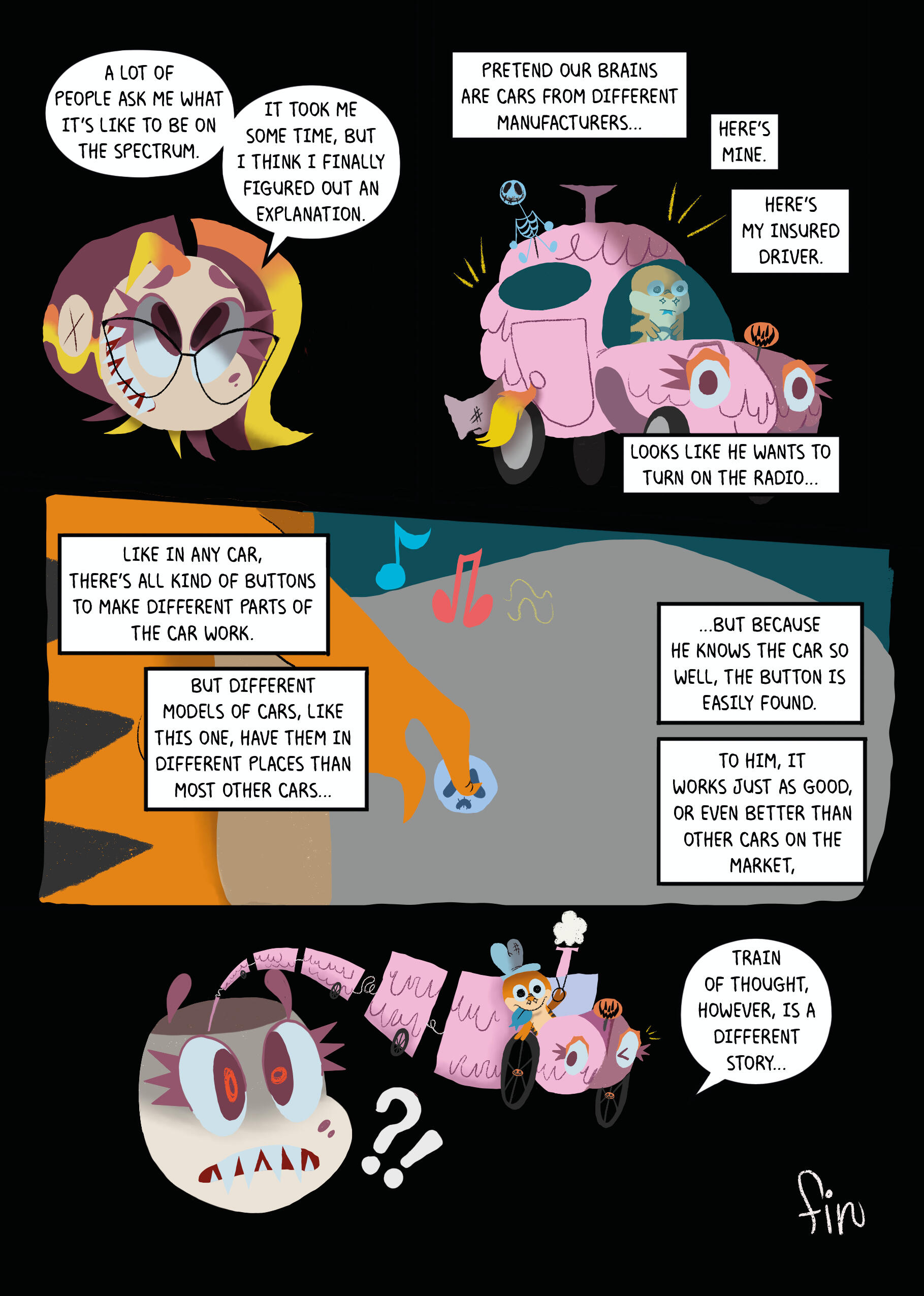 Hello! My name is Angelina Eddins, and I’m excited to share a little about myself with you.I’m a neurodivergent artist currently living in the vibrant Los Angeles area, and I am in the final stages of completing my B.F.A. in Entertainment Arts and Animation at CSUF. My passion for animation has always inspired me, and I’ve long dreamed of building a career in this amazing industry.During my studies, I had the incredible opportunity to dive into an illustrative background. I was fortunate to contribute to SENSORY: Life on The Spectrum, a graphic novel anthology devoted to autistic advocacy. Being a Ringo award nominee in 2022 and an Eisner award nominee in 2023 has been such a rewarding experience!When I'm not busy creating, you can find me getting my hair dyed at a horror-themed hair salon, playing catch with my adorable dog (who is actually a delightful 2-foot-long blue-tongued skink) with my fiancé, or admiring vintage cars! I’m the proud owner of a 1971 Volkswagen Super Beetle Convertible, affectionately named Jackie-Lantern.I would absolutely love to collaborate with you on your next project! I have experience in post-production as a colorist and am eager to explore other roles while discovering where I best fit in the industry. If you’re interested in discussing work opportunities or simply having a chat, please don’t hesitate to reach out!